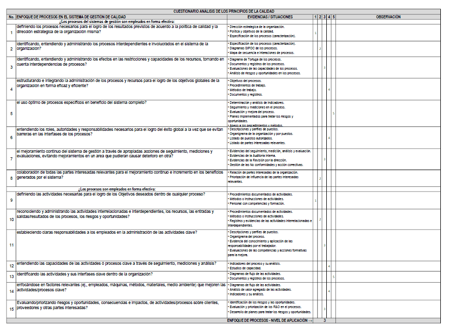 Al igual que el resto de los principios de la calidad, las organizaciones pueden asegurarse de la aplicación de este principio, monitoreando la realización de ciertas acciones que les permiten tener la certeza de que los principios están instalados y funcionado; para el principio Enfoque de procesos, dichas acciones pueden ser: