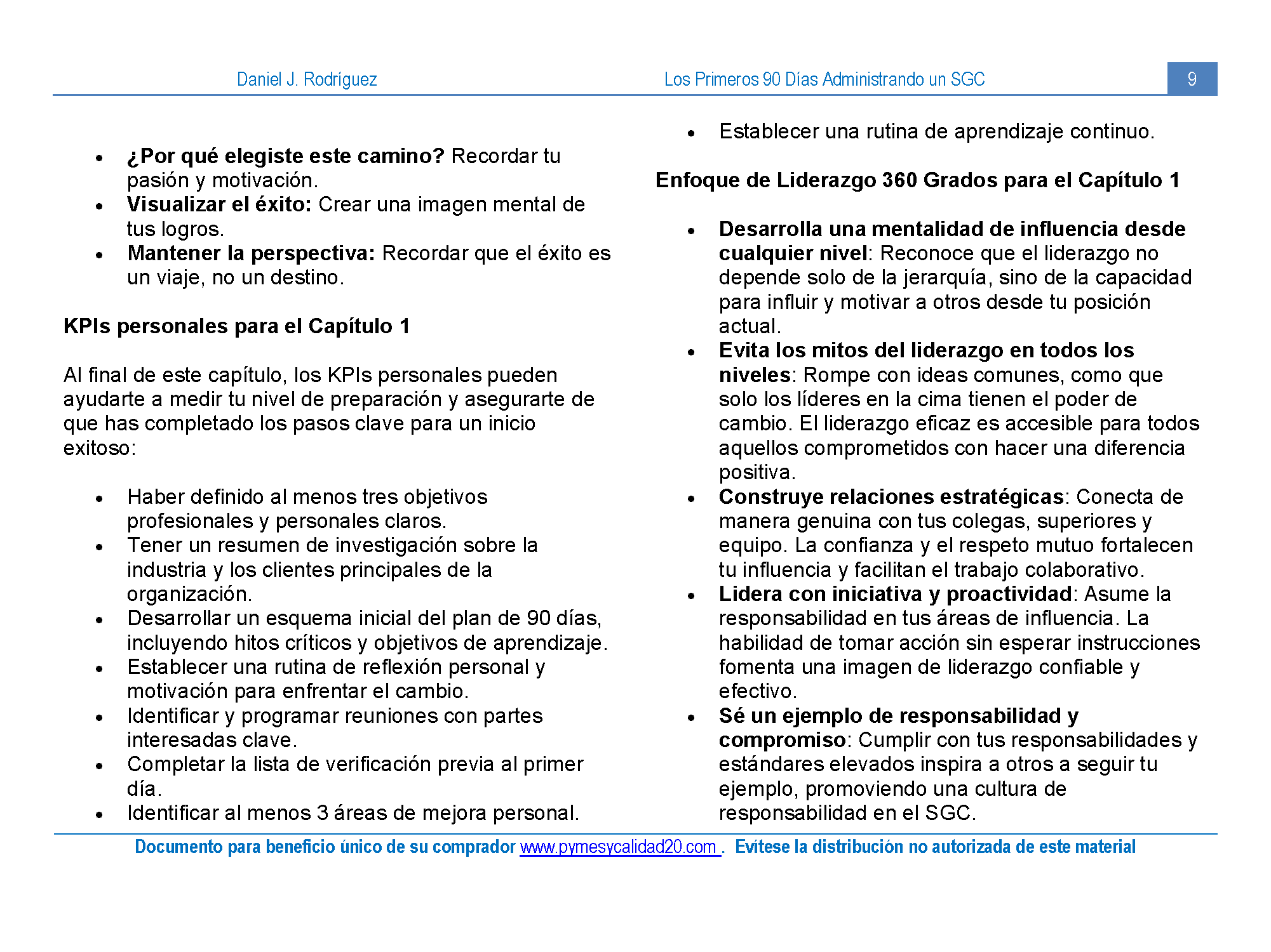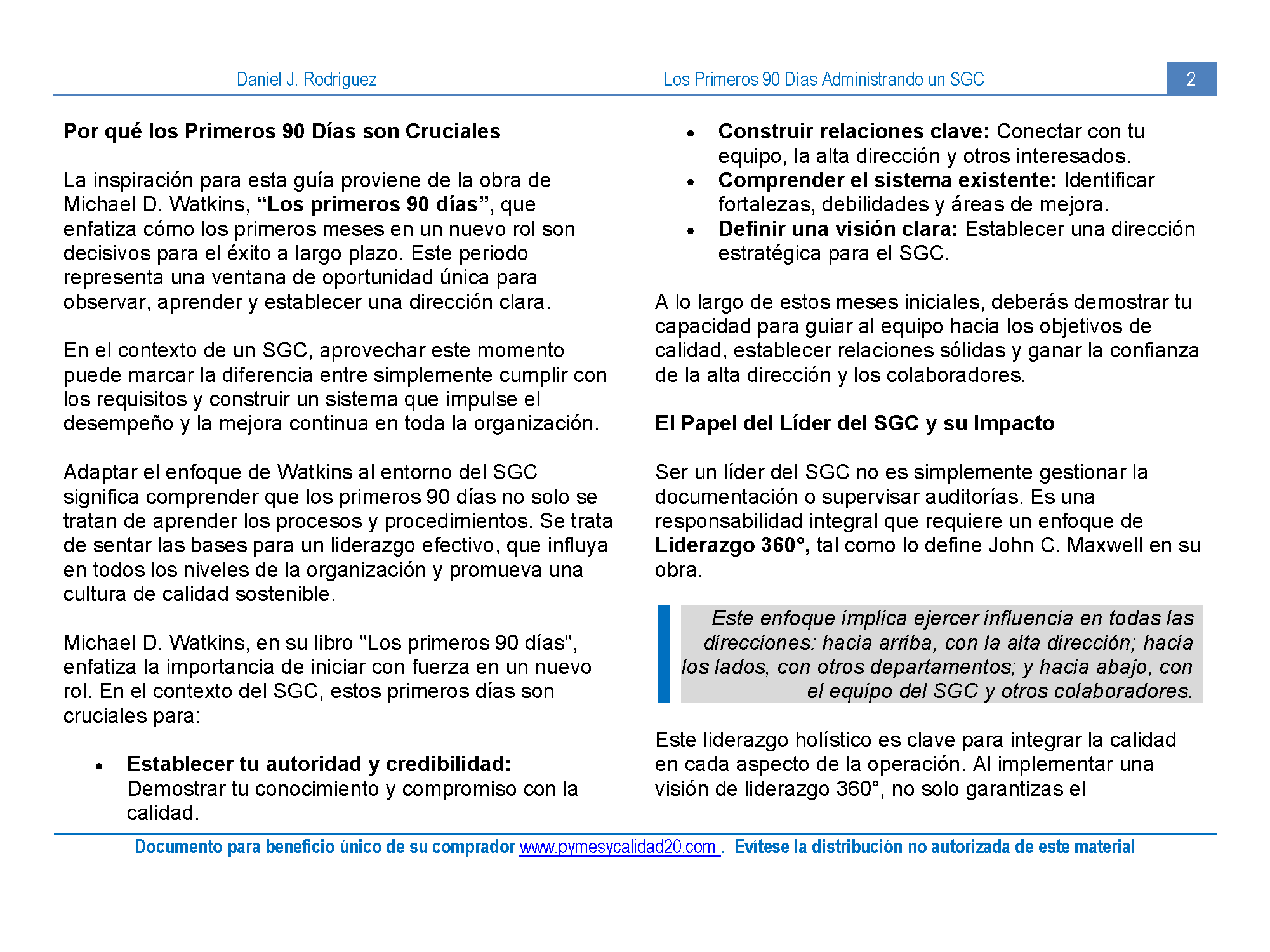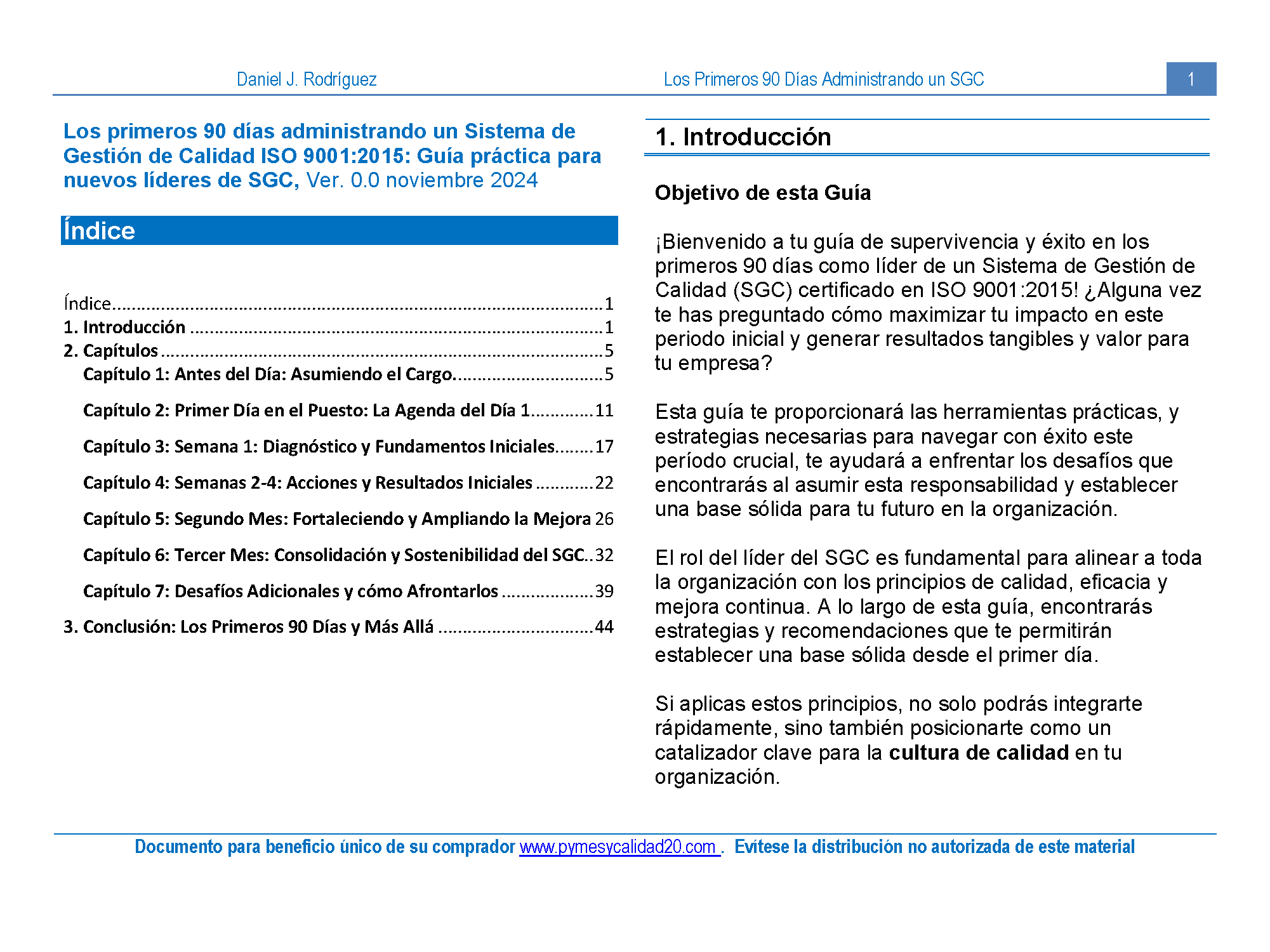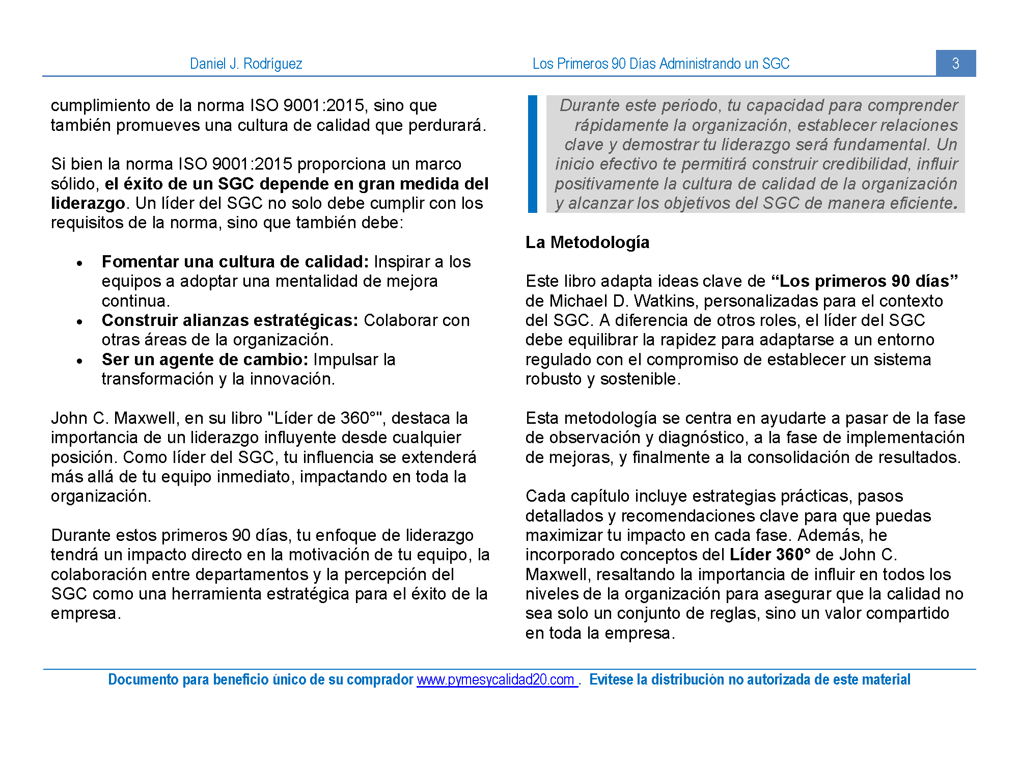Esta guía está diseñada para quienes asumen el liderazgo de un Sistema de Gestión de Calidad (SGC) ISO 9001:2015 y desean destacar desde el inicio. Basado en principios de «Los Primeros 90 Días» de Michael D. Watkins y el liderazgo de 360° de John C. Maxwell, este libro ofrece estrategias prácticas, listas de verificación y formatos editables para ayudarte a lograr resultados tangibles y generar valor en tu organización.
