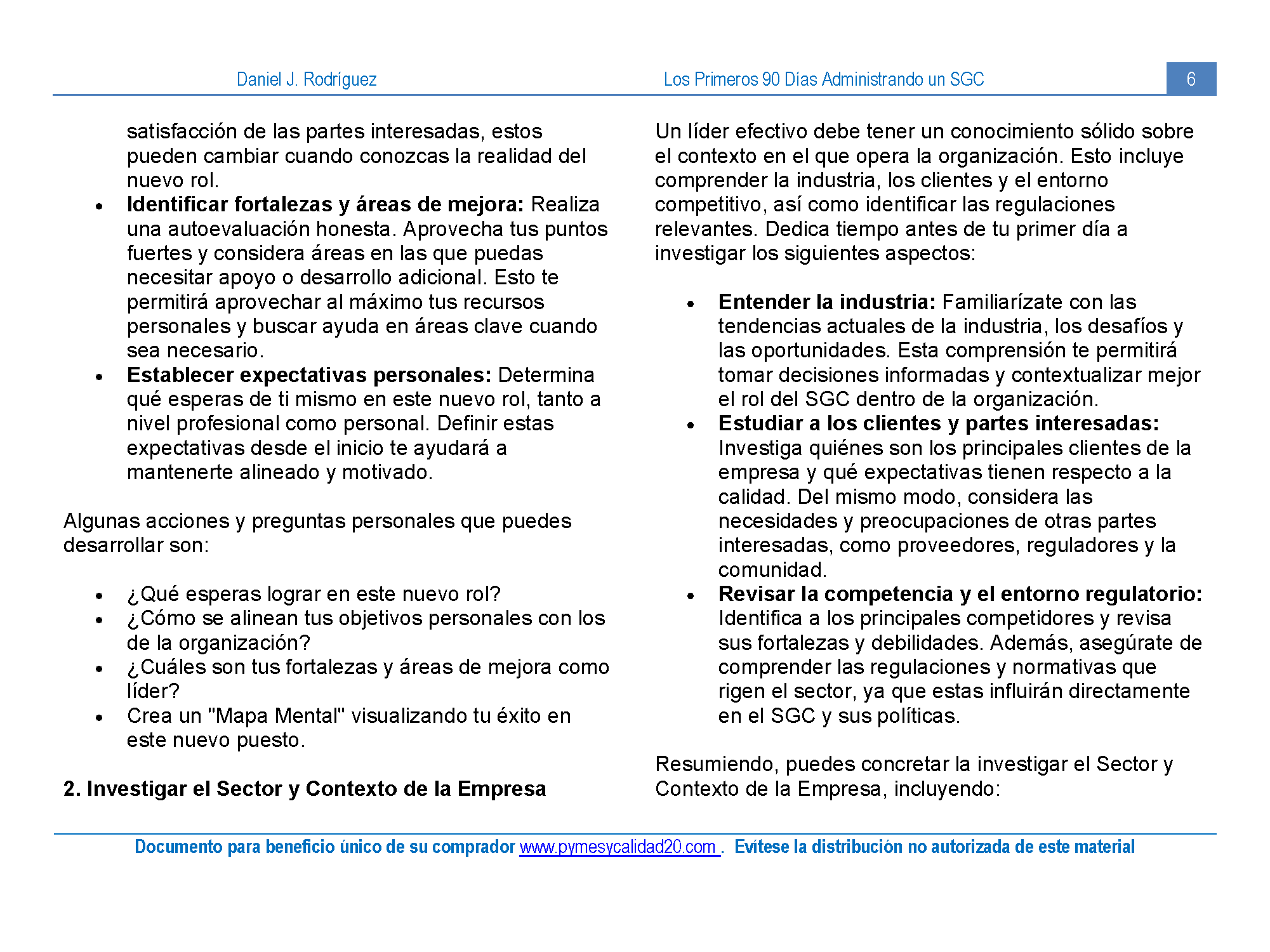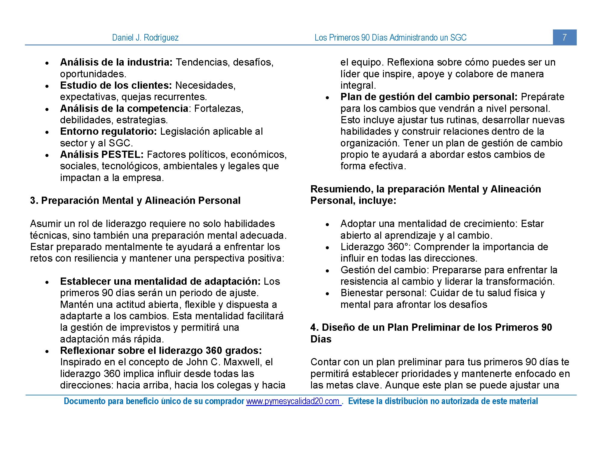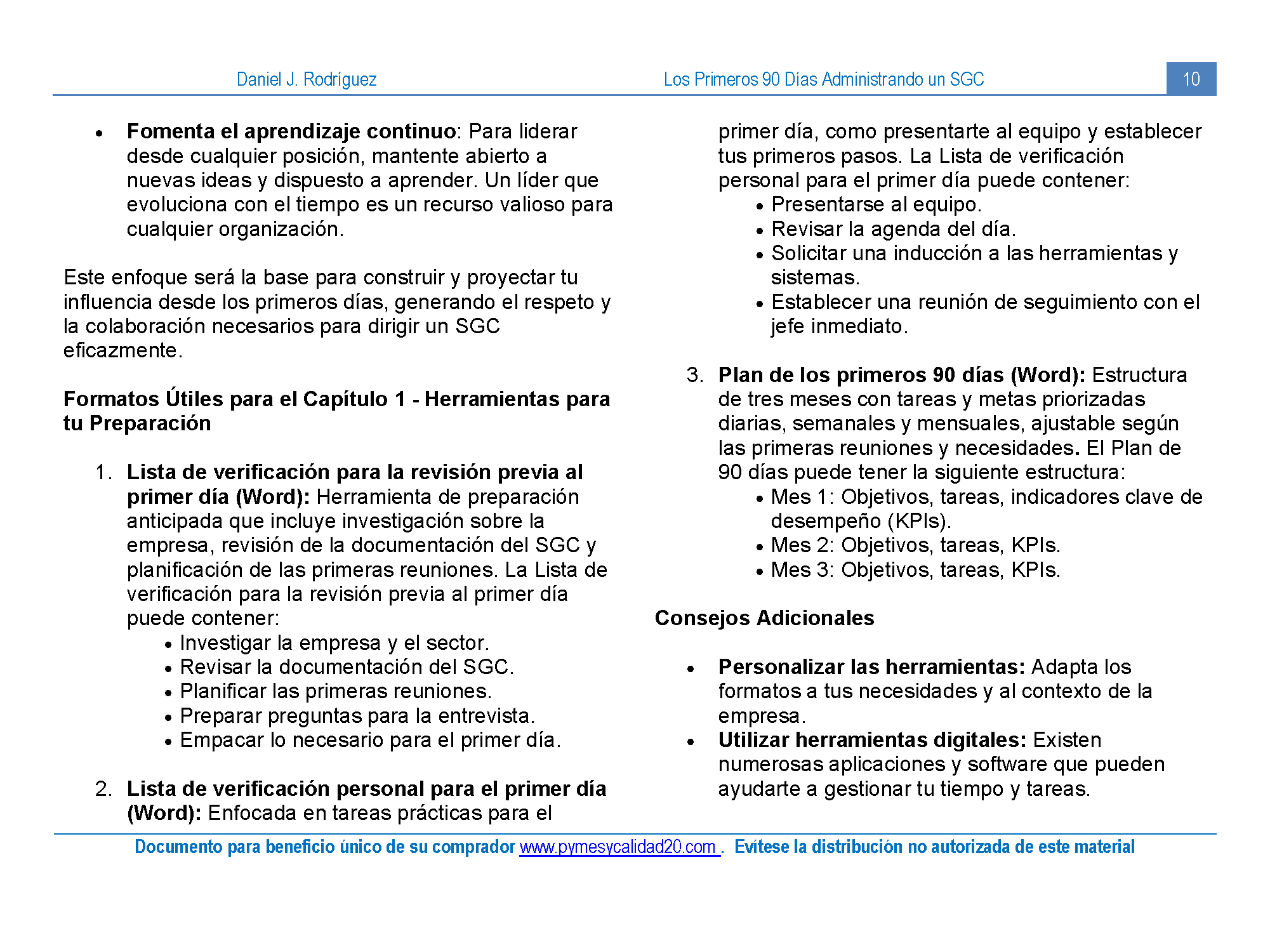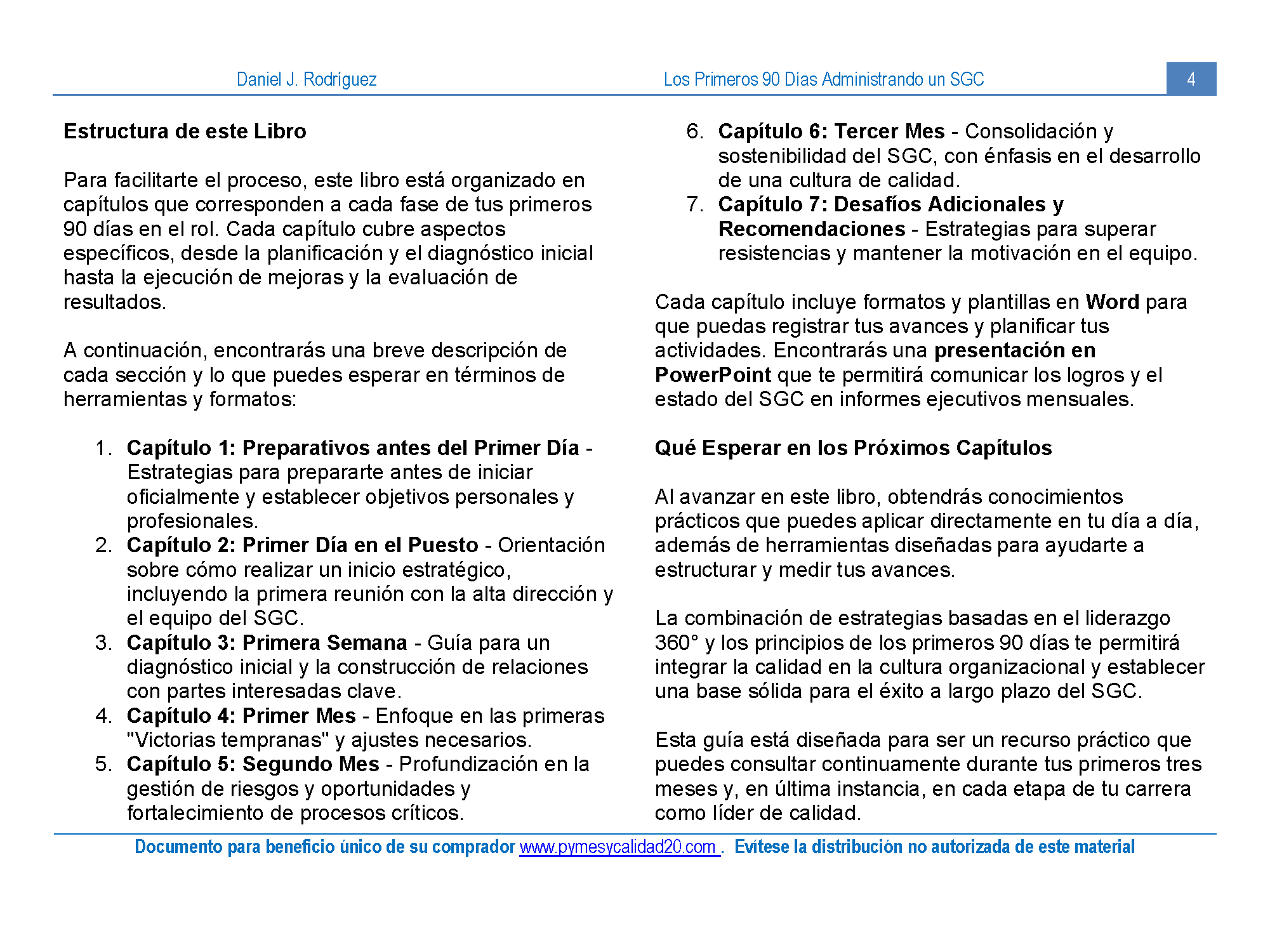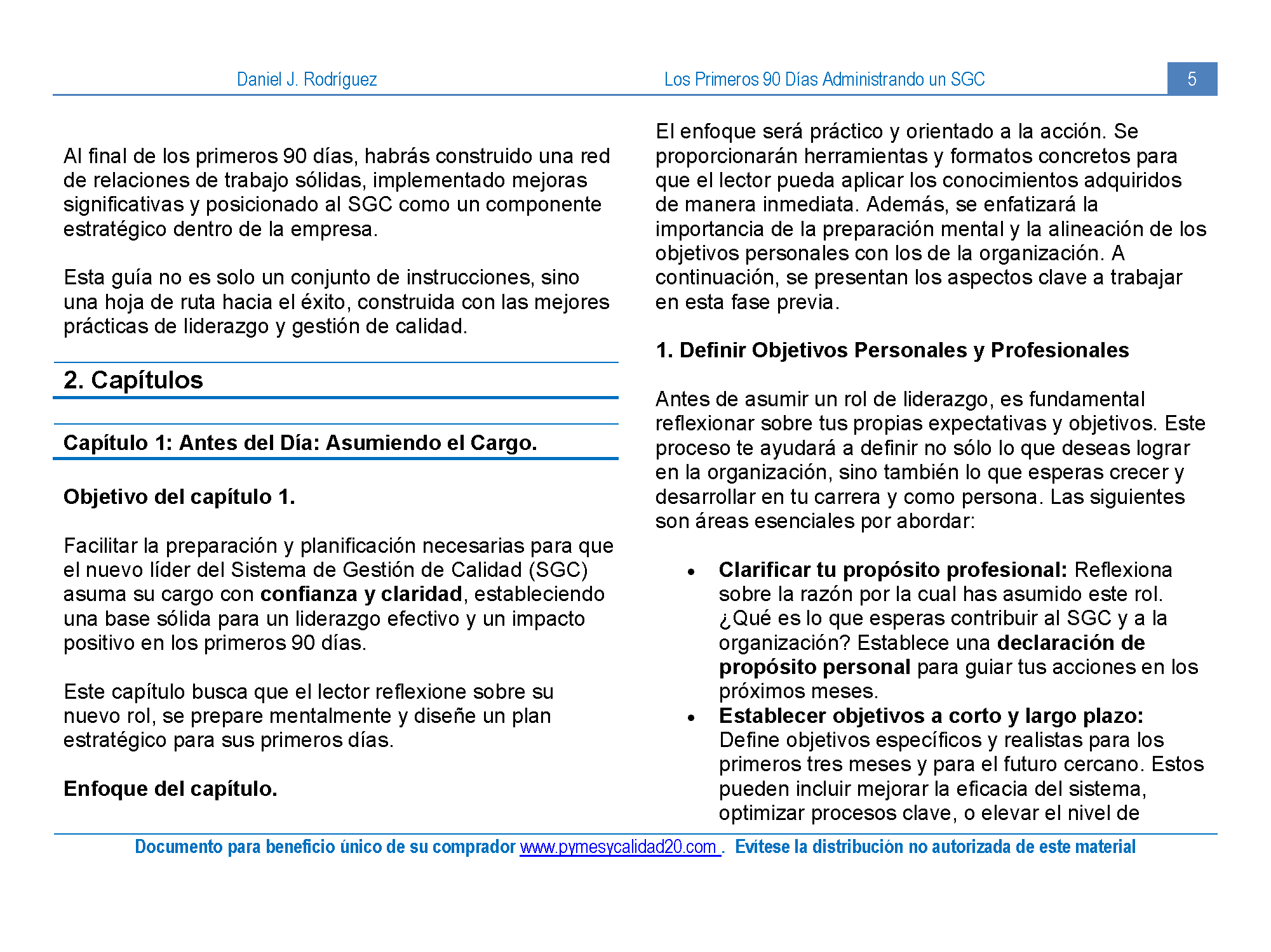 Esta guía está diseñada para quienes asumen el liderazgo de un Sistema de Gestión de Calidad (SGC) ISO 9001:2015 y desean destacar desde el inicio. Basado en principios de «Los Primeros 90 Días» de Michael D. Watkins y el liderazgo de 360° de John C. Maxwell, este libro ofrece estrategias prácticas, listas de verificación y formatos editables para ayudarte a lograr resultados tangibles y generar valor en tu organización.